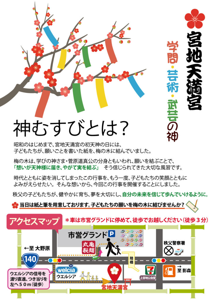 宮地天満宮には古くから子どもたちの風習があり、昭和のはじめまで、子どもたちが願いごとを紙に書き、境内の古い梅の木にむすんでいました。