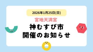 イベント情報2026年1月25日(日)宮地天満宮 神むすび市開催のお知らせ 2026年1月25日(日)に宮地天満宮で「神むすび市」が開催されます。宮地天満宮では毎年、1月の第4土曜日に初天神が行われ、この日に合わせて初めて「神むすび市」を開催することになりました。神むすび市は、むかし宮地天満宮で昭和初期まで続いてい... 2026.01.14イベント情報